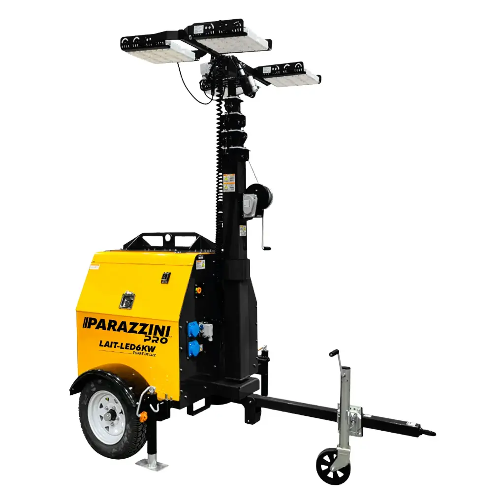 Diseñada para la movilidad y la estabilidad, la LAIT-LED6KW está montada sobre un remolque robusto con neumáticos de alta tracción y estabilizadores ajustables que garantizan una operación segura incluso en terrenos irregulares o bajo condiciones de viento moderado. El motor de alto desempeño asegura una autonomía prolongada, permitiendo jornadas completas de iluminación sin interrupciones.